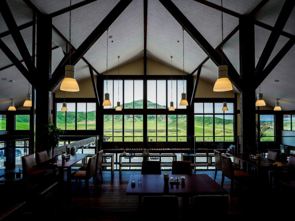 その正面に佇む「ドゥースヌッカ」は、雄大な烏帽子岳を見晴らしながら食事や買い物を楽しめる、おしゃれで優雅な憩いの場です。大きな窓からは草千里の広大な景色が広がり、阿蘇らしい開放感を満喫できます。