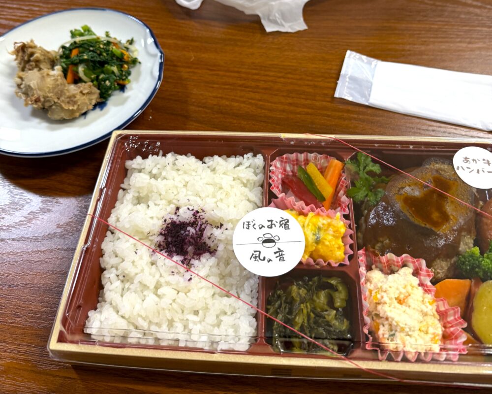 お昼ごはんは公民館で、楢木野地区の皆様が作ってくださった里芋料理と、道の駅阿蘇に出展している「風の音」のお弁当をいただきました。