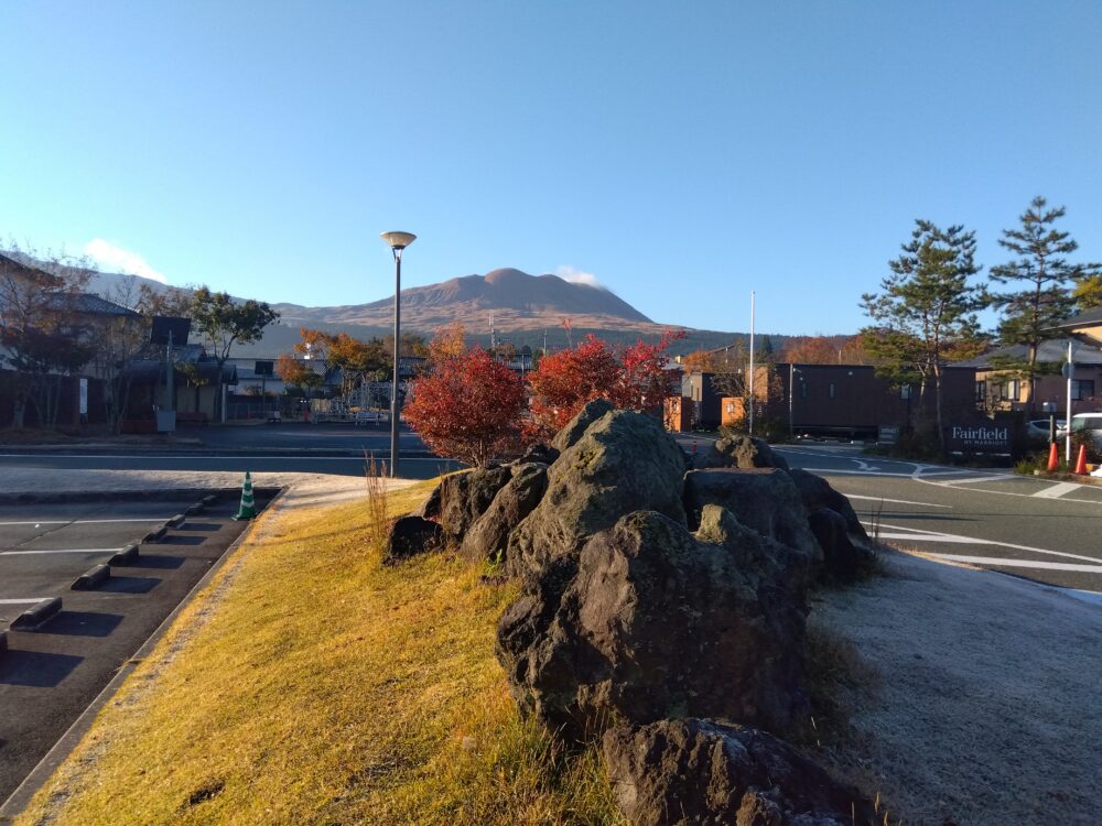 阿蘇駅真正面から見た本日の往生岳、並びに杵島岳↓