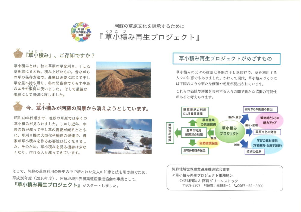 草小積みは、草原景観の再生や生物多様性の保全、そして阿蘇の文化や歴史を未来へつないでいく大切な役割を担っています。