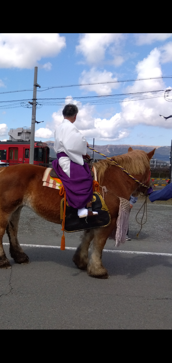 タマタマ、姫君をお乗せした馬さんとその背に乗った神職と、そしてJR豊肥線をバックに撮れました👇