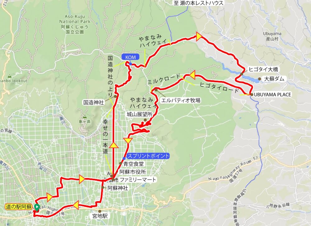 【コルナゴ部長コメント】コース上にはKOMポイント、スプリントポイント、トイレ2ヵ所、食事処3ヵ所、少し先にコンビニがあり、門前町や阿蘇神社にも近いので観光を兼ねてもいいでしょう。
